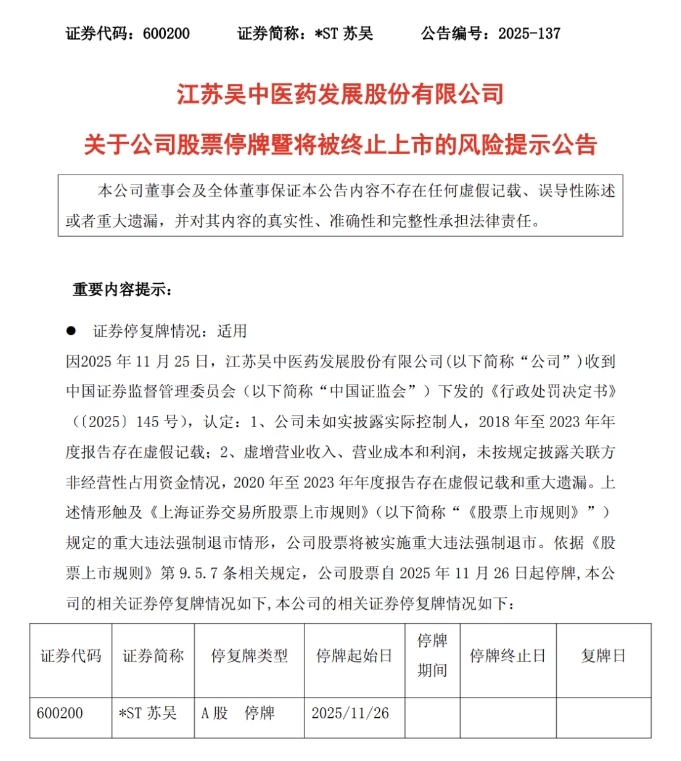 11月25日晚,*ST苏吴(600200)公告称,公司收到中国证监会《行政处罚决定书》,认定公司未如实披露实际控制人股票账户配资,2018年至2023年年度报告存在虚假记载;虚增营业收入、营业成本和利润,未按规定披露关联方非经营性占用资金情况,2020年至2023年年度报告存在虚假记载和重大遗漏。上述情形触及《股票上市规则》规定的重大违法强制退市情形,公司股票将被实施重大违法强制退市。公司股票自2025年11月26日起停牌。